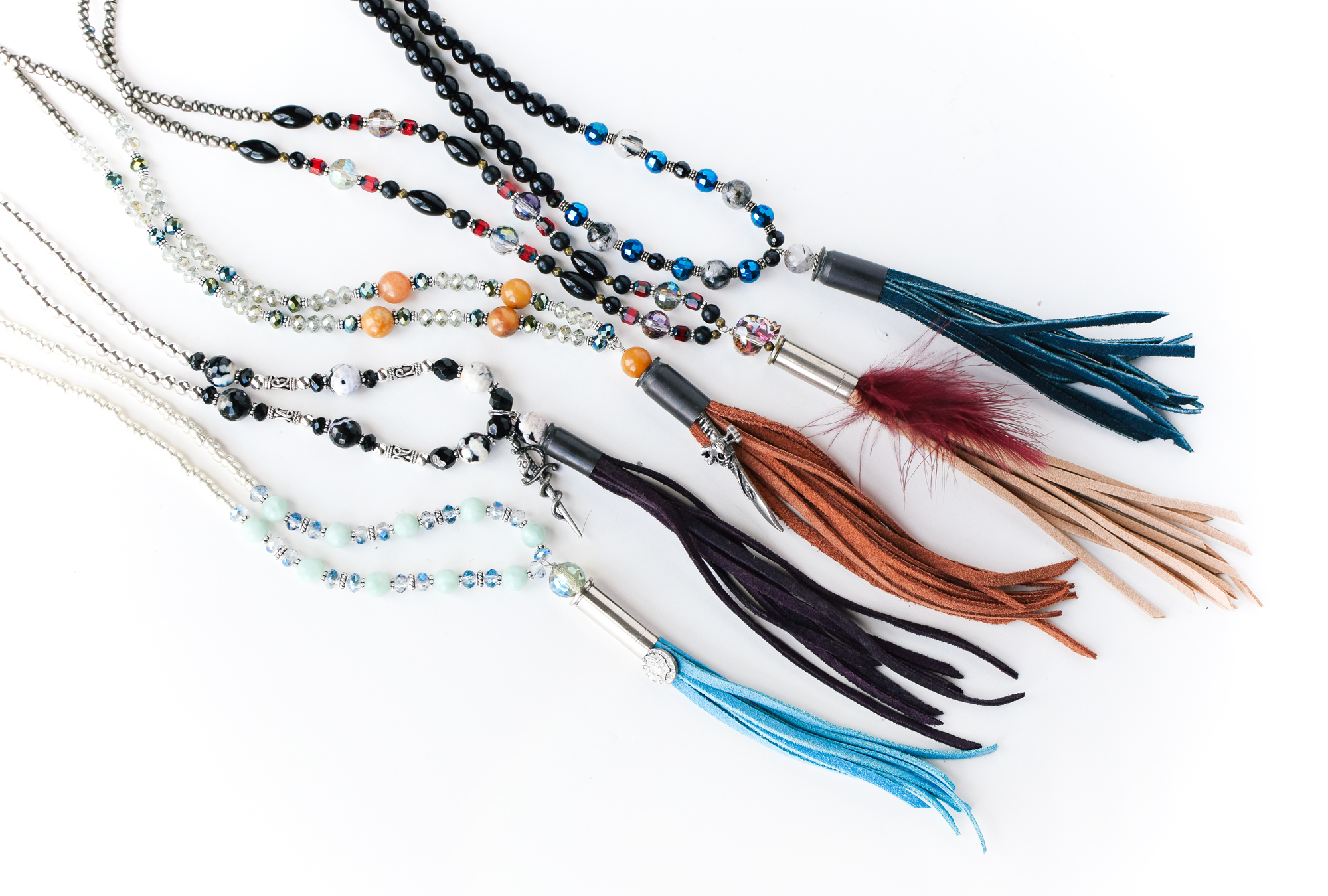 Boho bullets star in these bold tassel necklaces - mix stones, crystals, leather, charms and more mix to create an eclectic look!