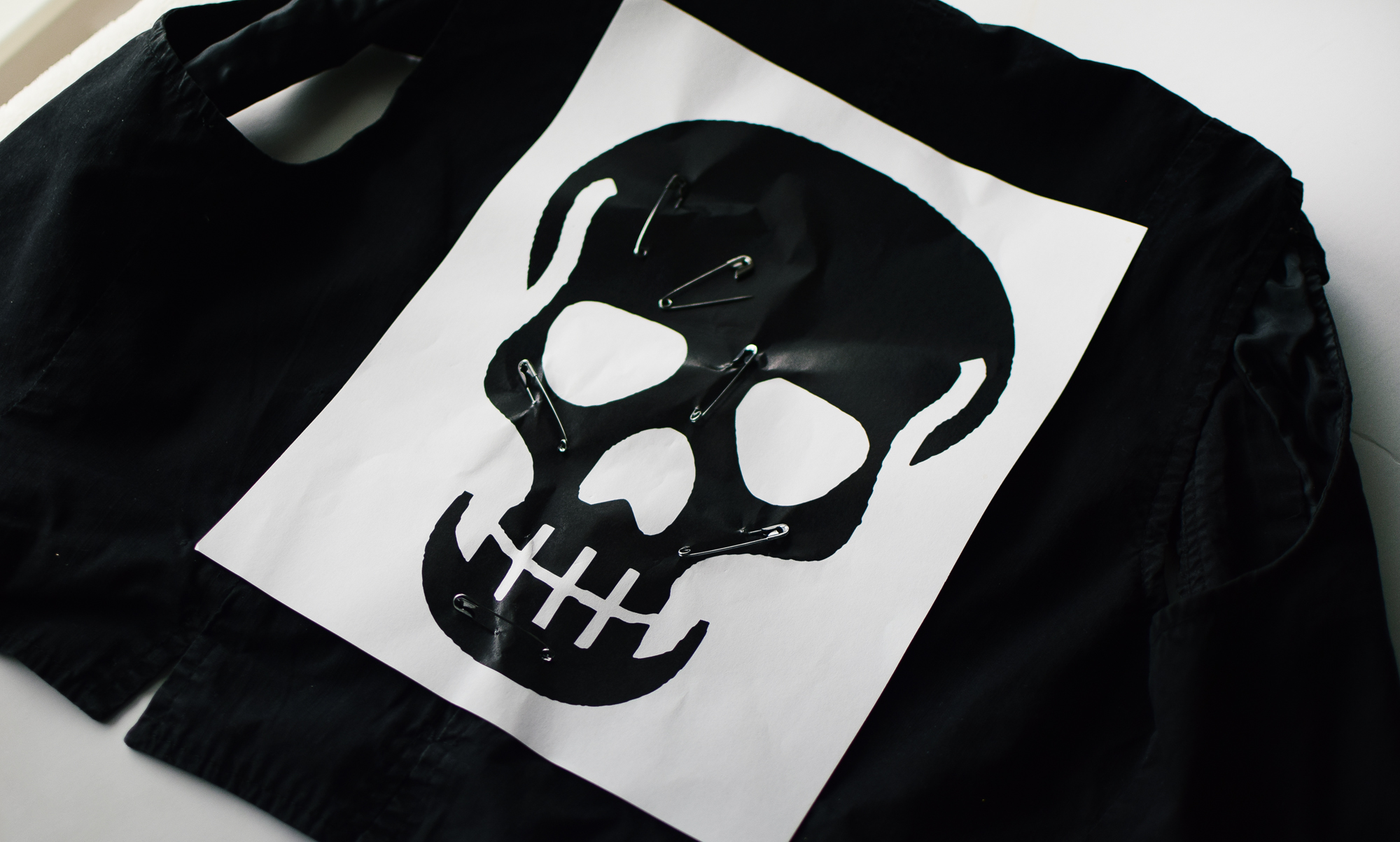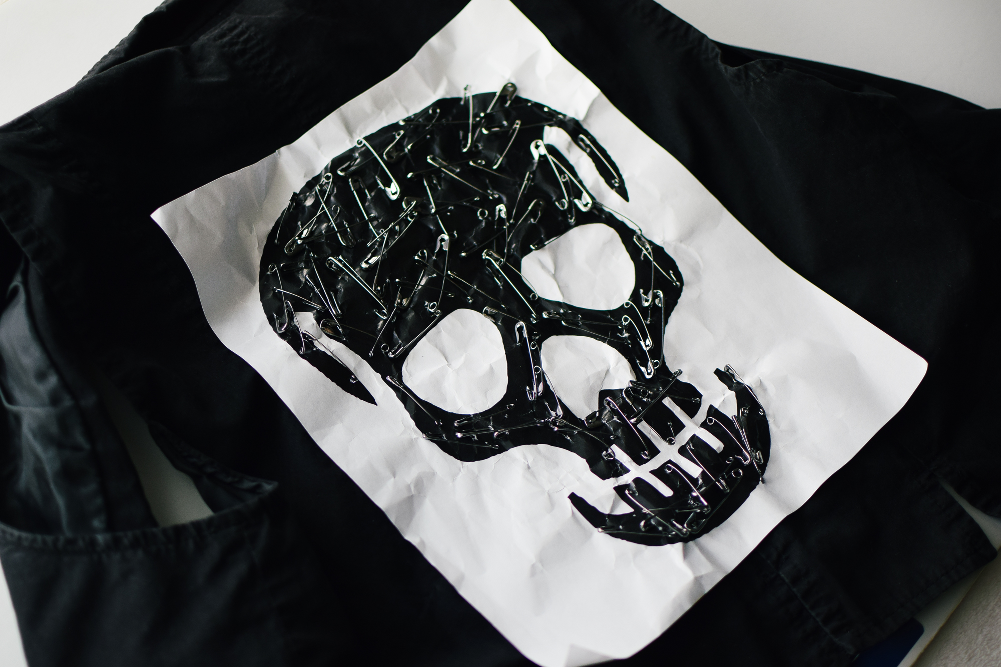 Step 1: Gather materials. You’ll need a vest or jacket, safety pins, a printout of a skull (or other stencil you want to trace), flatback gems and GemTac or fabric glue.