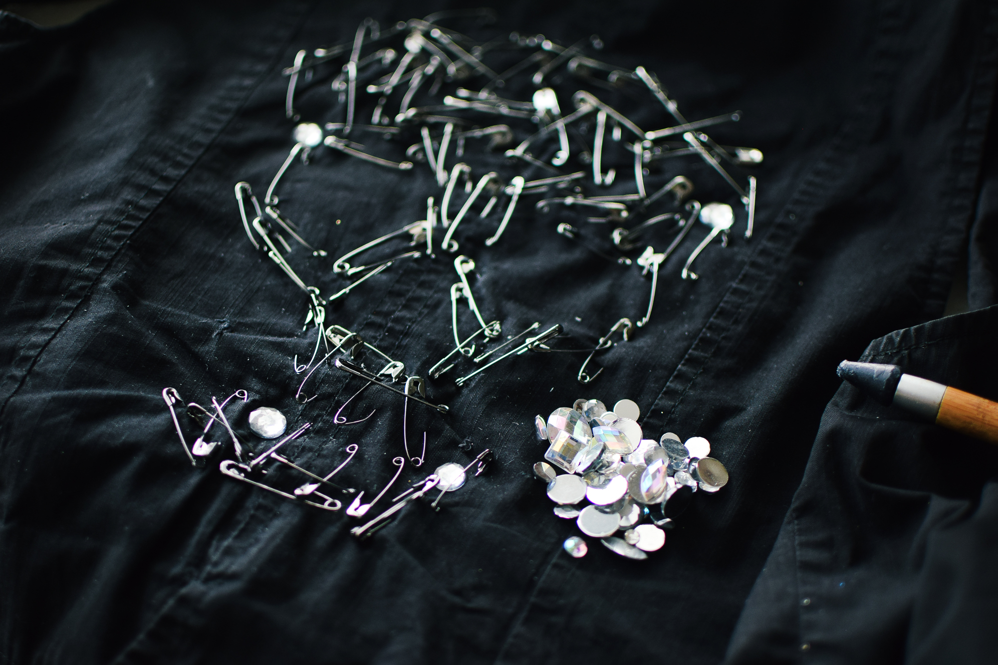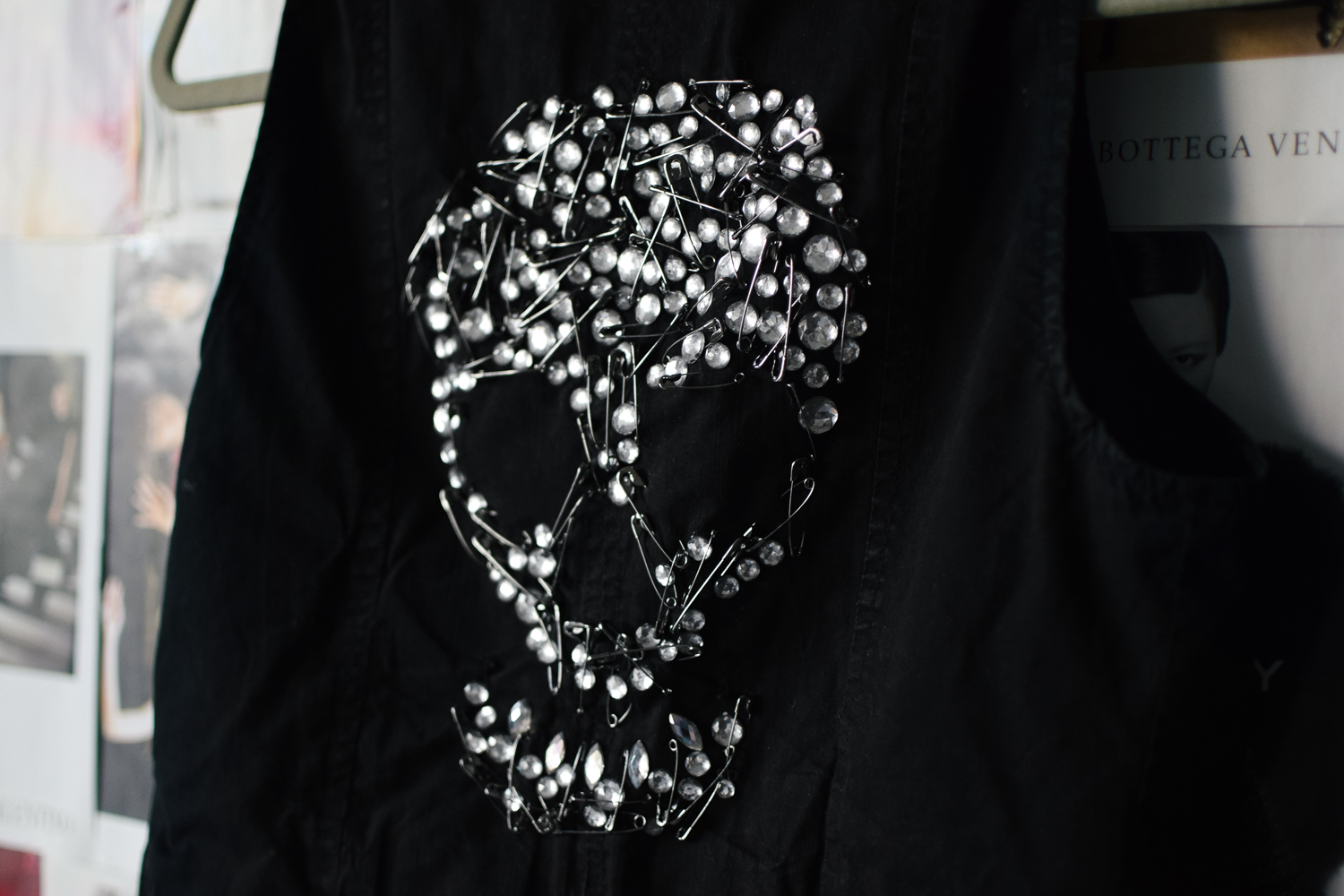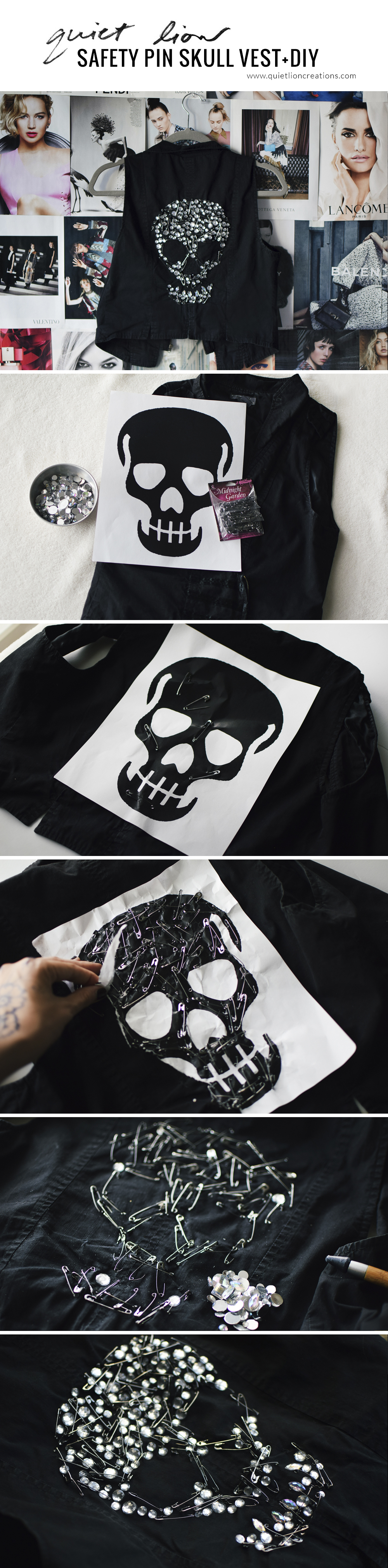 It’s all about easy upcycling with this DIY safety pin skull vest…… Have a plain sweater, vest or jacket that could use some extra sparkle? Give it some punk-rock love with the addition of safety pins and crystals for a totally cool transformation!