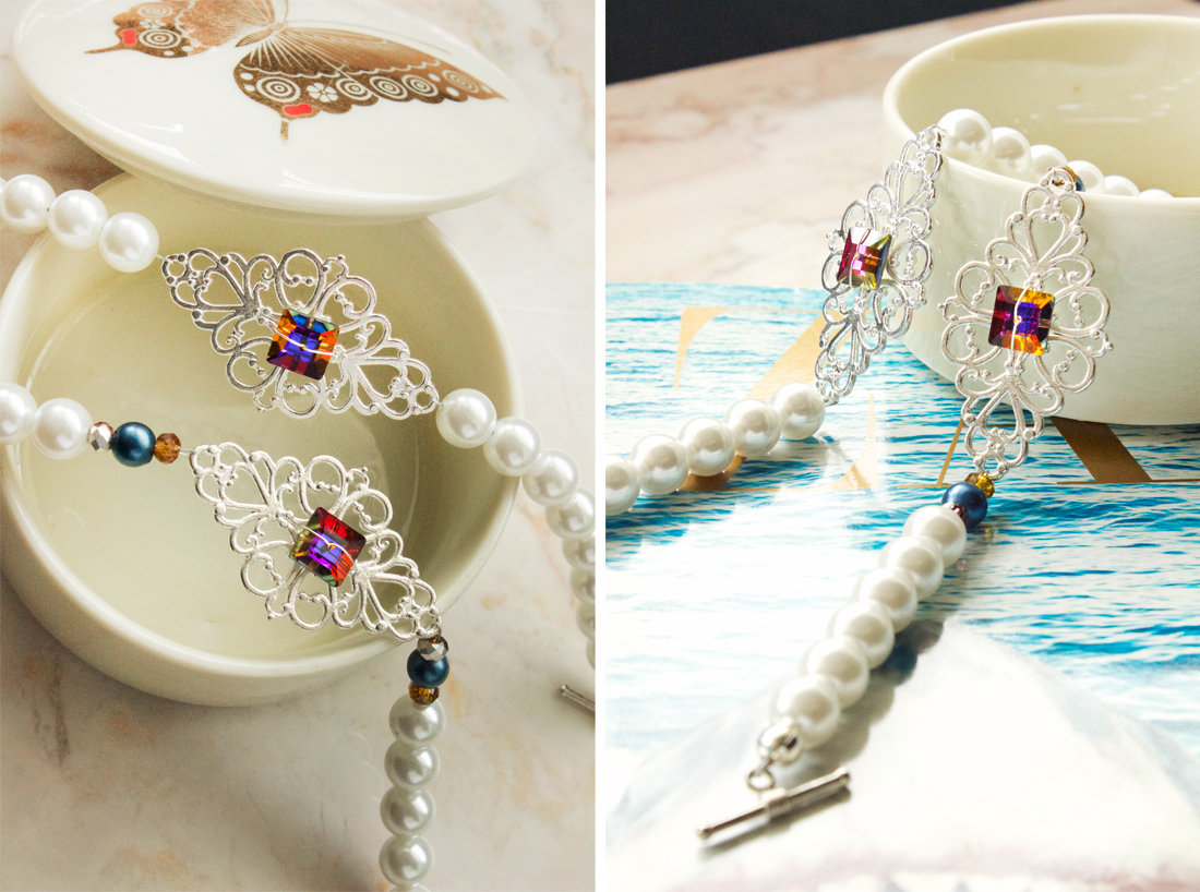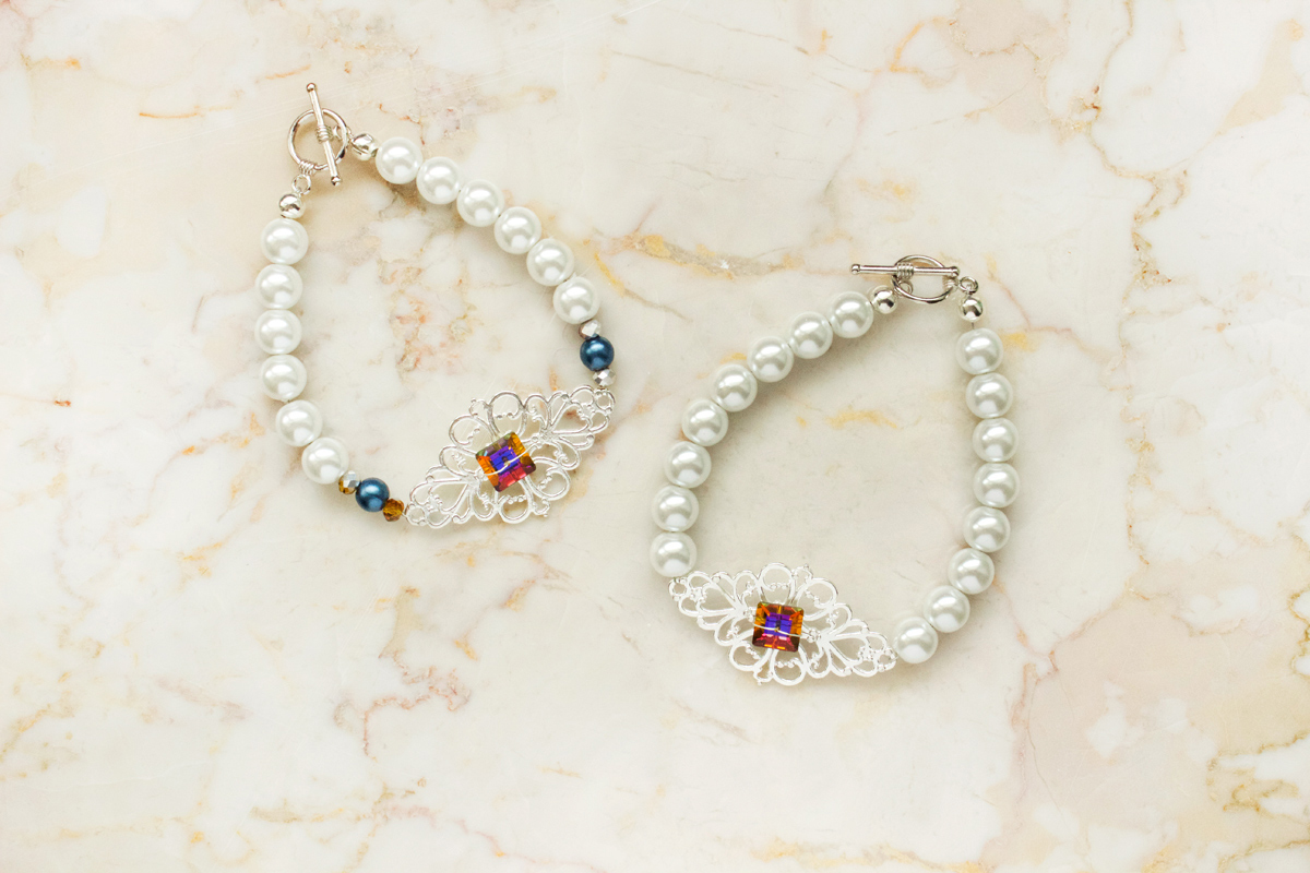 Filigree is always a good choice; the intricate swirls of metal and high shine add such a luxe touch to any piece of jewelry. And, when you add a Swarovski rhinestone and smooth pearls to contrast, a perfectly dressy-chic accessory is made.
