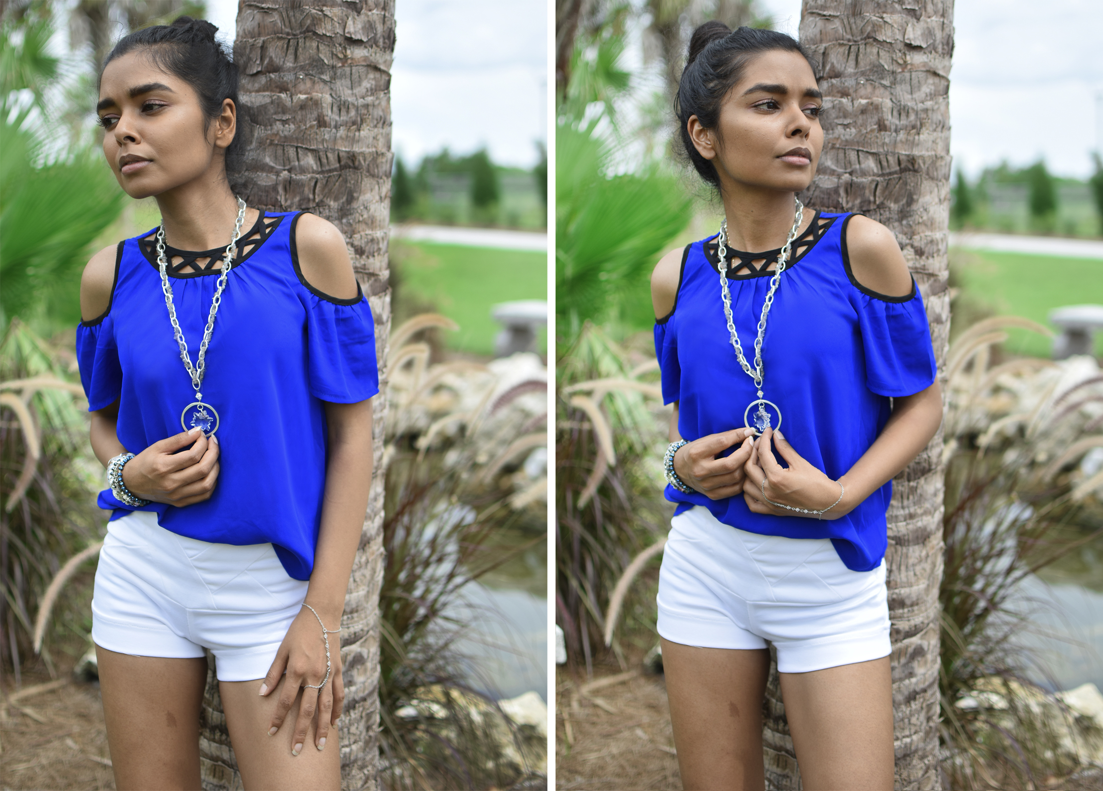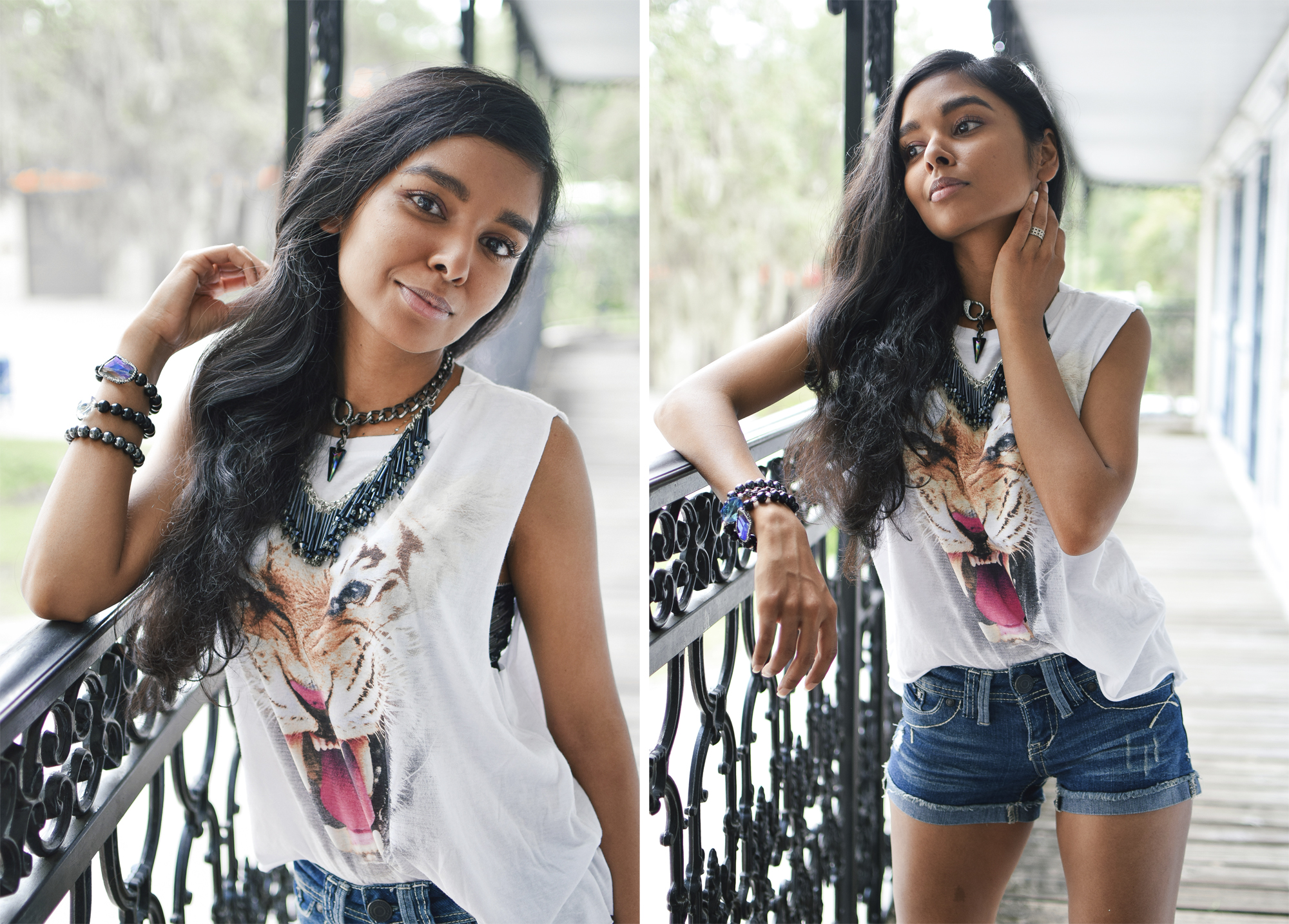 Our first ensemble is as free as this insane Florida beach breeze - why is it always a windstorm during our shoots?! I think it was a little worse last shoot, tbh, so hopefully next time we’ll just be dealing with a gentle, balmy day (key word: hopefully…). Fringe kimono: check. Flower in hair: check. DIY Dreamcatcher necklace: a definite check! I made this mini dreamcatcher by wrapping thread and leather around a large “O” jewelry component - web the thread in the middle, then finish with charms and feathers.