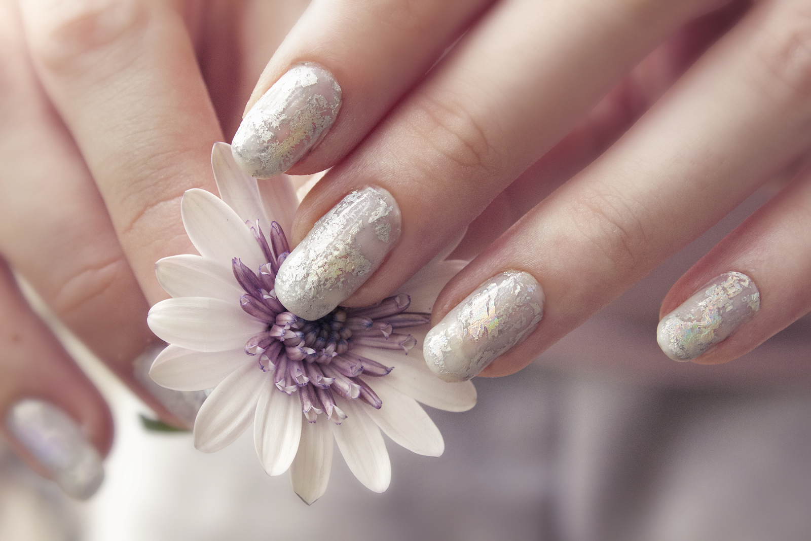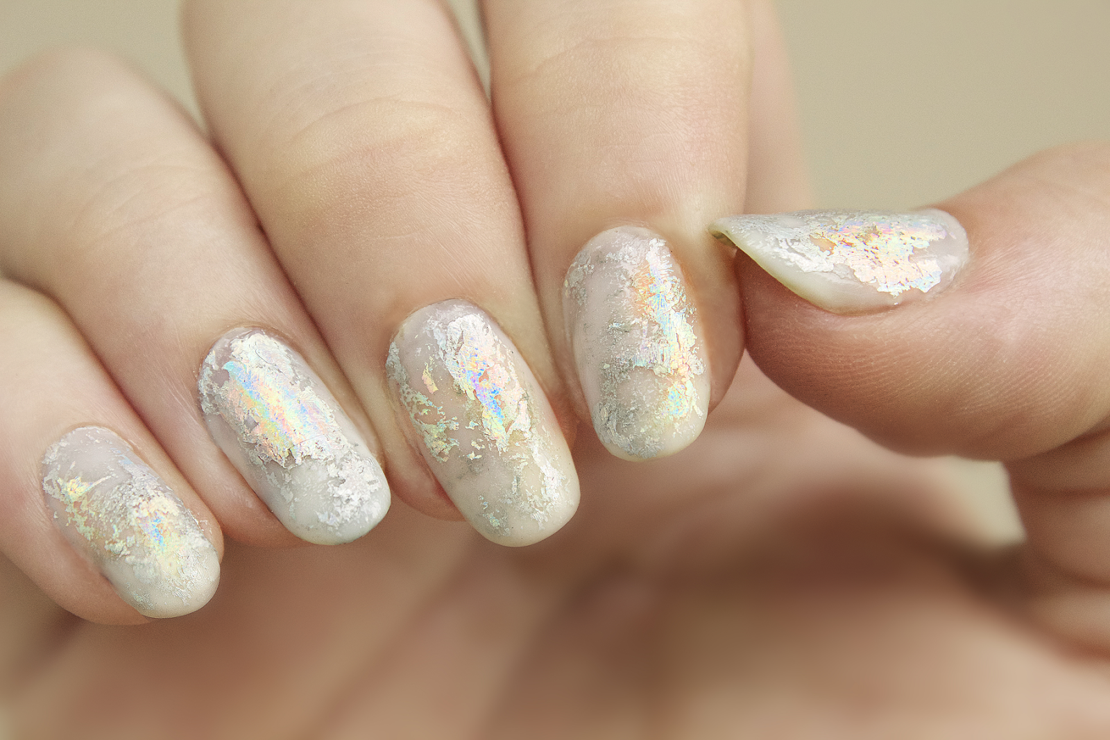 I used Born Pretty Store silver metal nail foil. I first did a white gel manicure using Sally Hansen UV set gel polish White Away. Then, I put a thin top clear coat and pressed the foil sheets down in multiple spots on my nails. after you lift up the foil, some sticks to the nail, creating that “flecked” design.