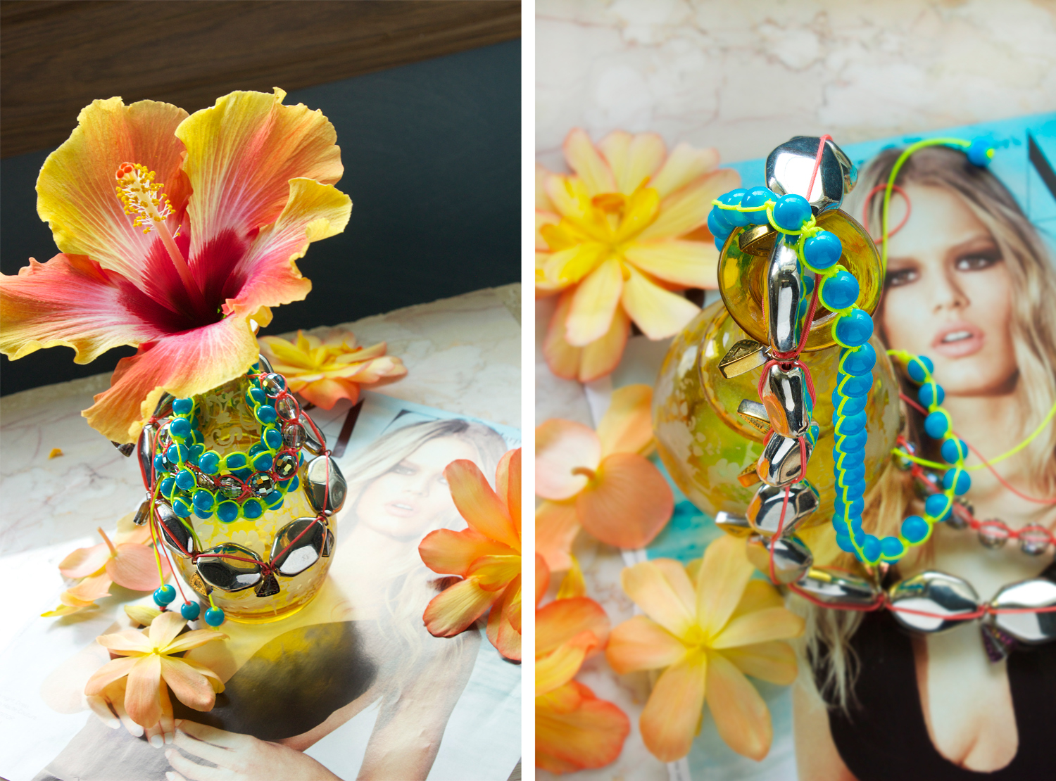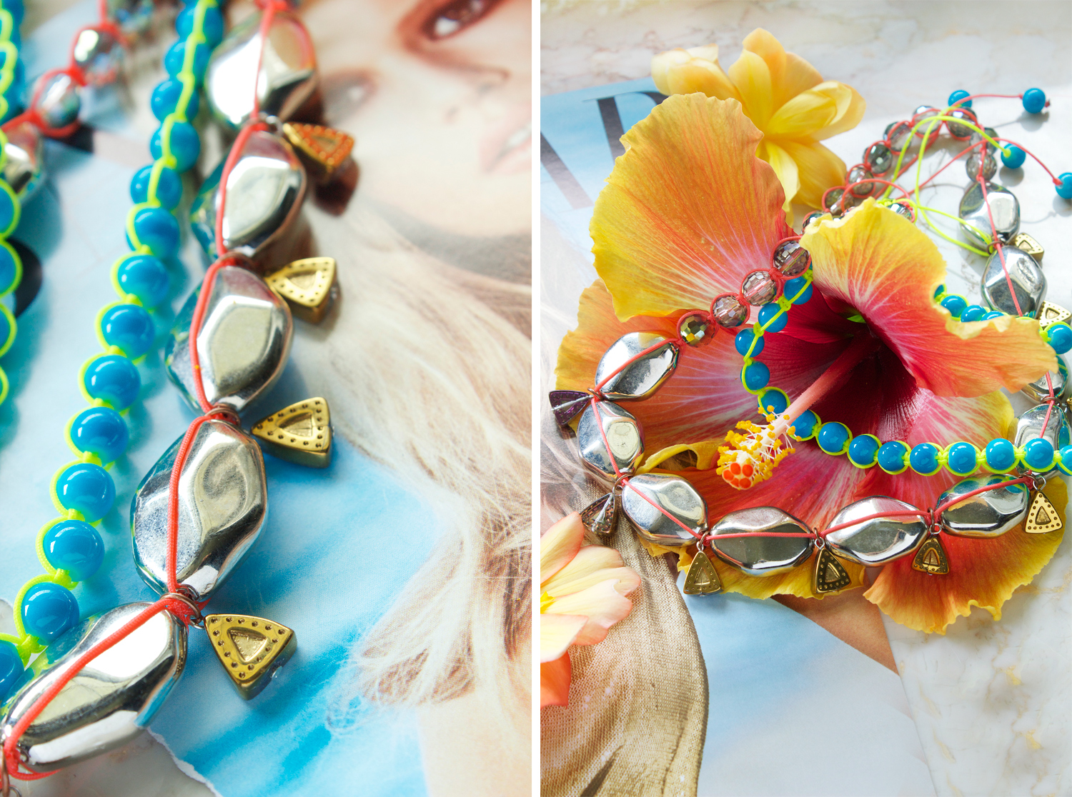This macrame necklace definitely brings the heat, thanks to a mix of bright silver metallics, neon cording, and flashy faceted crystals. I really love any piece that makes a statement, and this DIY jewelry project inspired by South Beach totally tells a story. If you’ve never thought to use macrame knots in a more updated and sophisticated way, then now’s your chance!