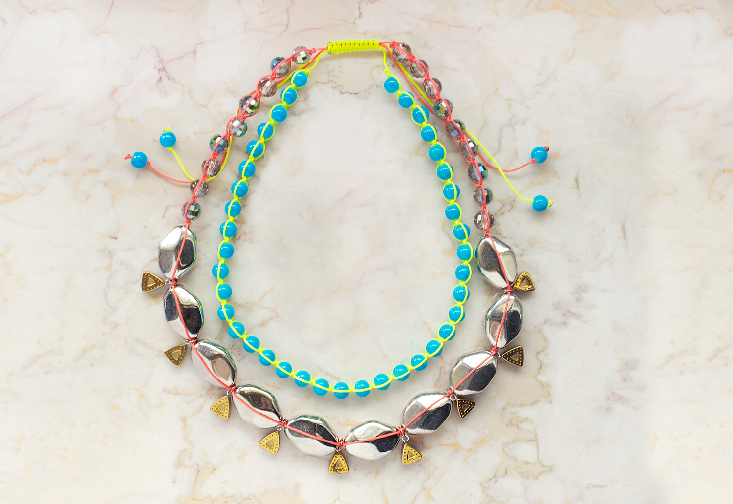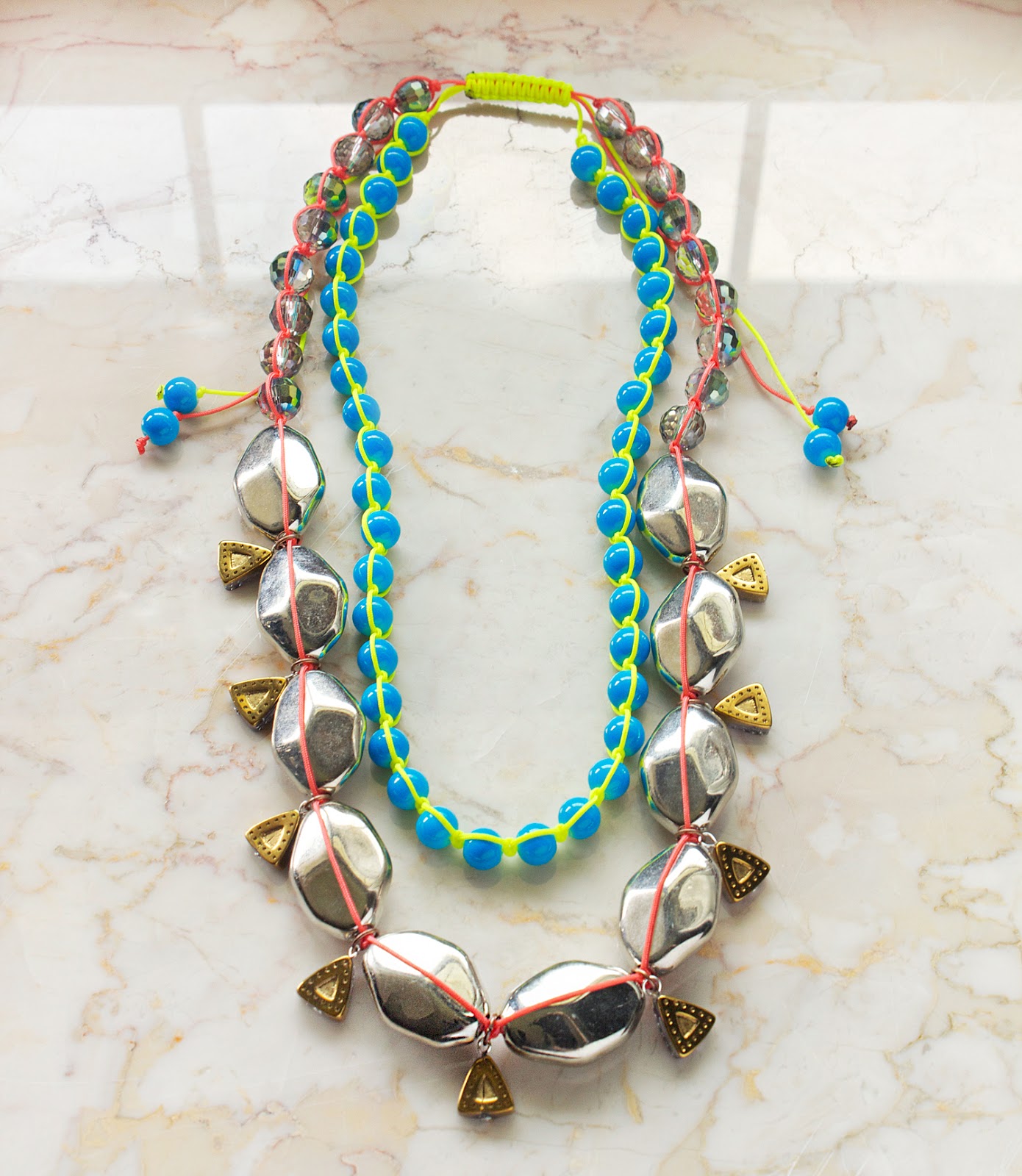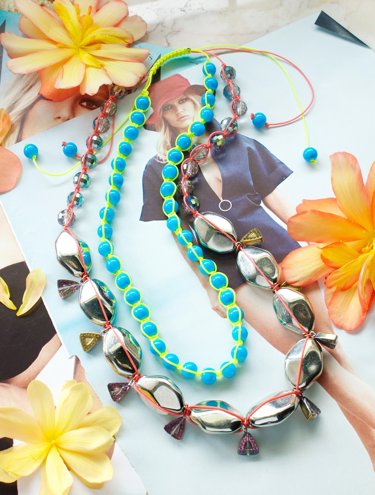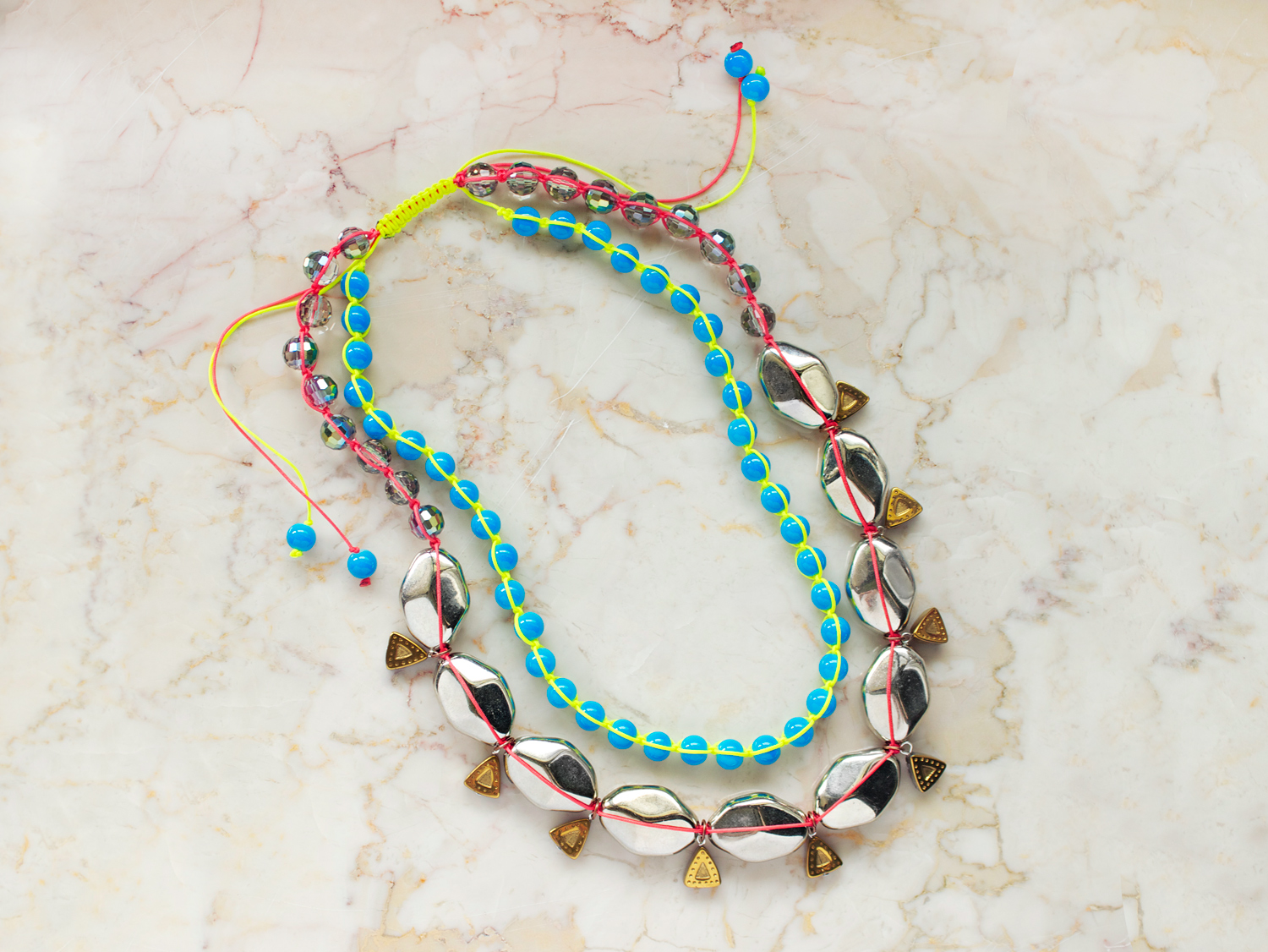 This is sort of a weird mix of materials. Fancy crystals, acrylic geometric beads, bright blue glass rounds, eclectic triangle beads, and that neon cord! But, somehow, it totally works and it totally conveys that South Beach, Art Deco vibe! I took a trip to South Beach years ago and was fascinated with the architecture, bold bright colors, and 1920’s-inspired design elements. This necklace embodies that tropical mood. What’s more, this DIY necklace is adjustable because of the sliding closure. It’s also a simple square knot that creates the wrapped look, and I’ll show you all the steps. Feel free to use this same technique to make a matching bracelet or more necklaces in different color combos for different outfits. Get inspired! Once you get that square knot technique down, making pieces like this will get easier. You can play around with the amount of knots in-between each bead to space them out more, if you’d like. Also, if you aren’t digging the neon (why not?!) feel free to choose your color palette.