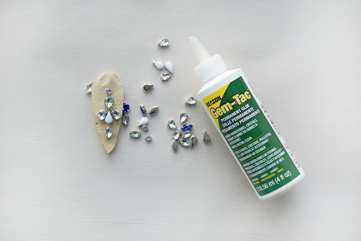 Step 2: Simply glue on your chatons to the flat side of the arrowhead. Choose any particular pattern that suits the shape of your arrowhead. Use small drops of Gem-Tac to adhere the stones. Let dry.