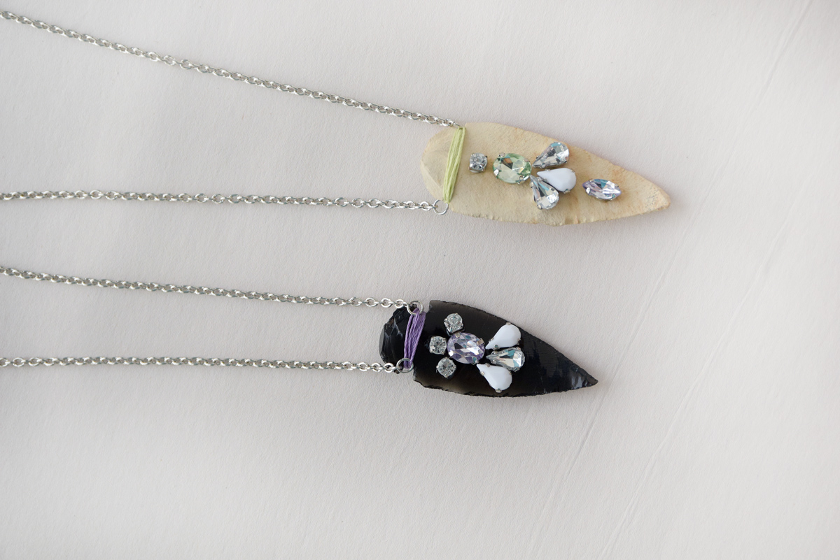 Another idea I had with these is the idea of painting them first - use gold or silver metallic paint and completely coat the arrowhead. Then add gems as usual. Would create an even more luxe-looking piece!