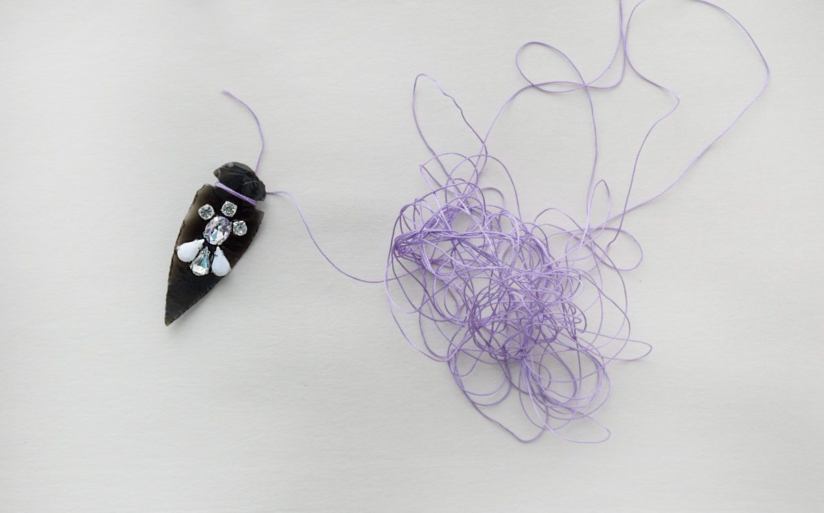 Step 1: Gather materials. I used two arrowheads (you can find a big pack here and here), silver cable chain, a silver toggle clasp, 4mm jump rings, wire cutters, flat nose pliers, Beacon Gem-Tac, rhinestone chatons (or you can use flat backs!), and silky embroidery floss.