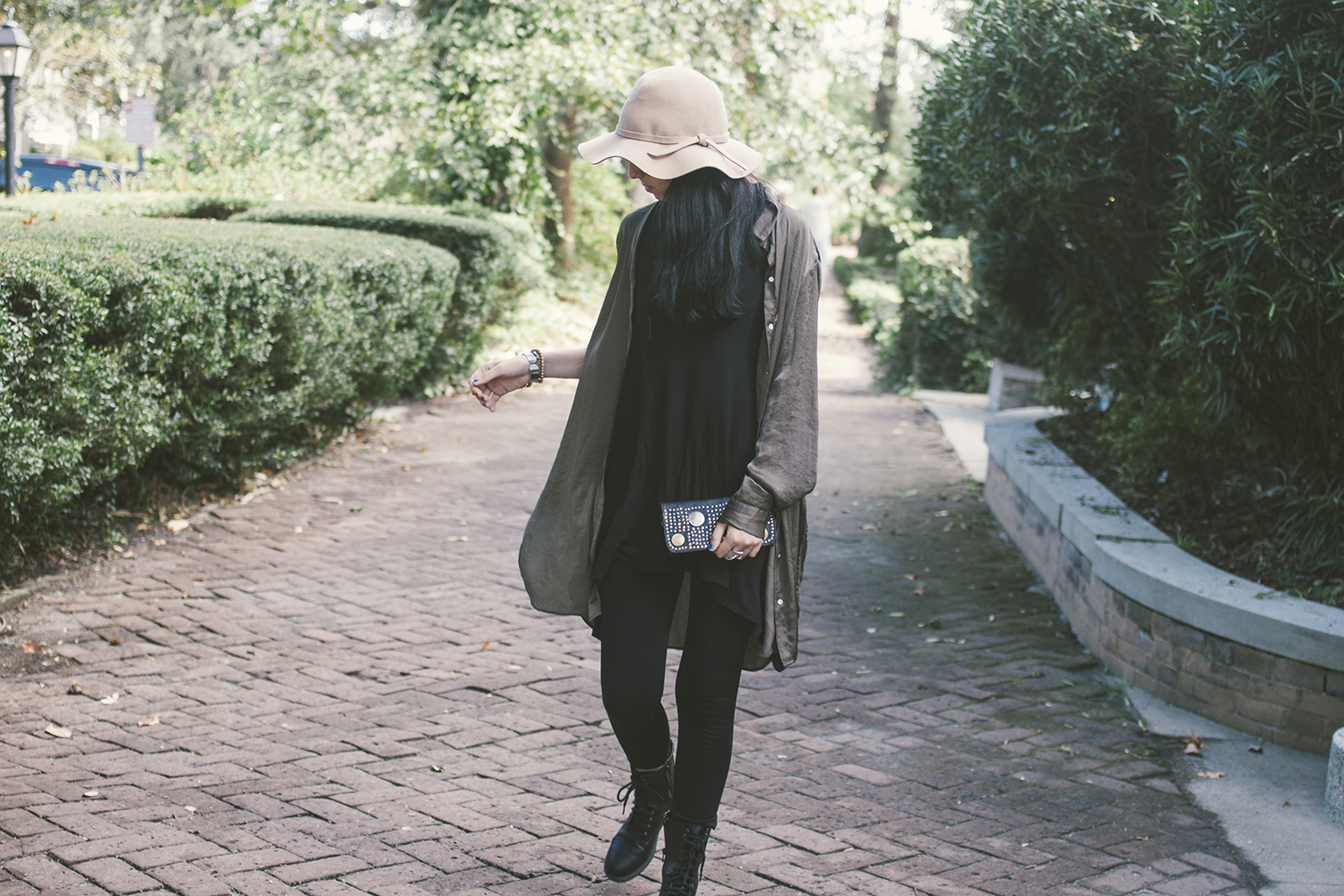 The olive greens of Savannah, Georgia perfectly complimented my pre-planned outfit. Black is always the answer, but this time, is matched with a super silky Zara jacket and tawny floppy hat.