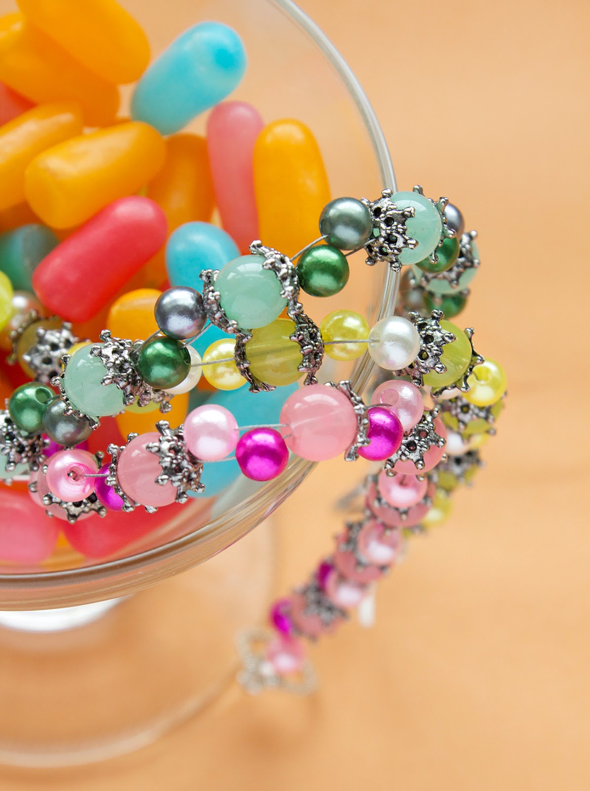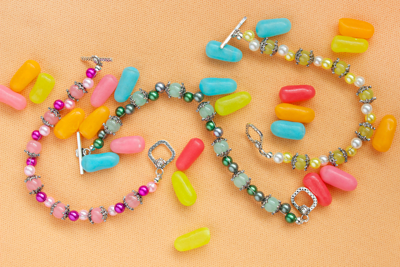 Fun, fruity hues of strawberry pink, lemon yellow and kiwi green plus the soft sheen of classy pearls mix here to make bright and bold stacking bracelets. These are the perfect bracelets for both kids and adults - I think the sophistication of the bead caps and pearls contrasted by the more playful color schemes makes for an all-ages accessory!