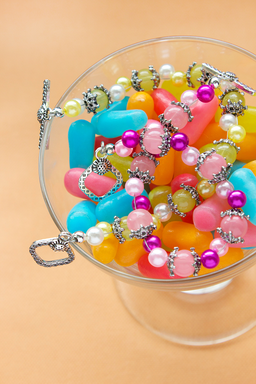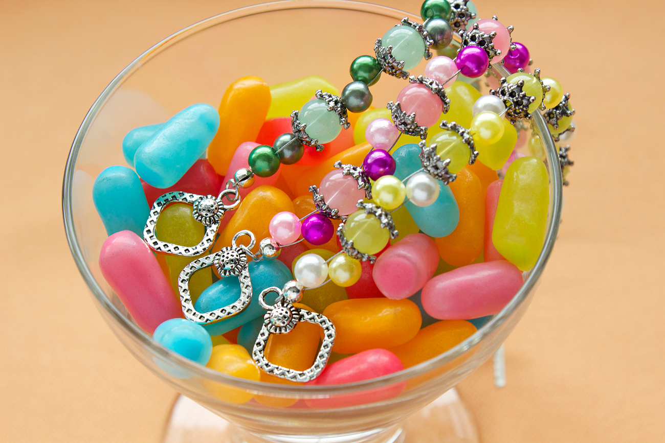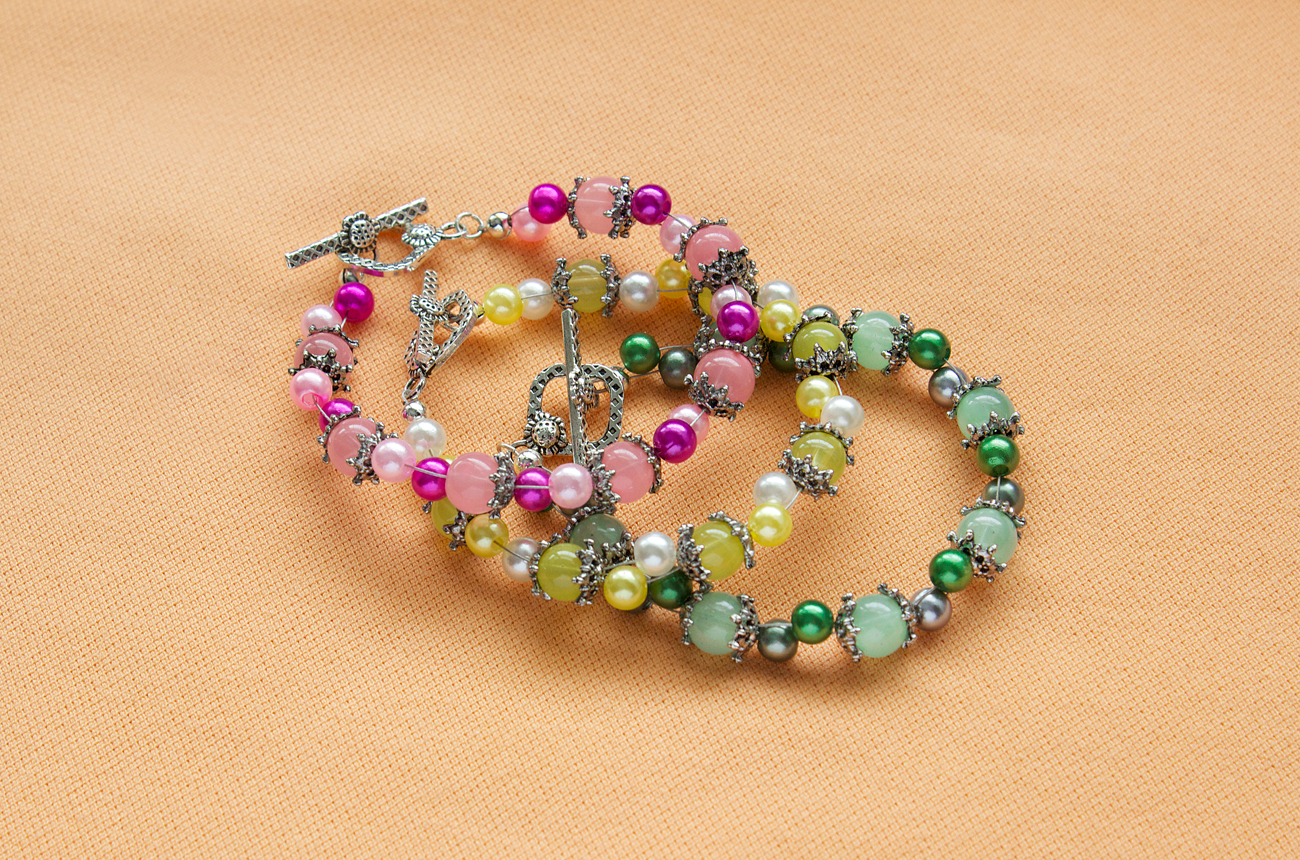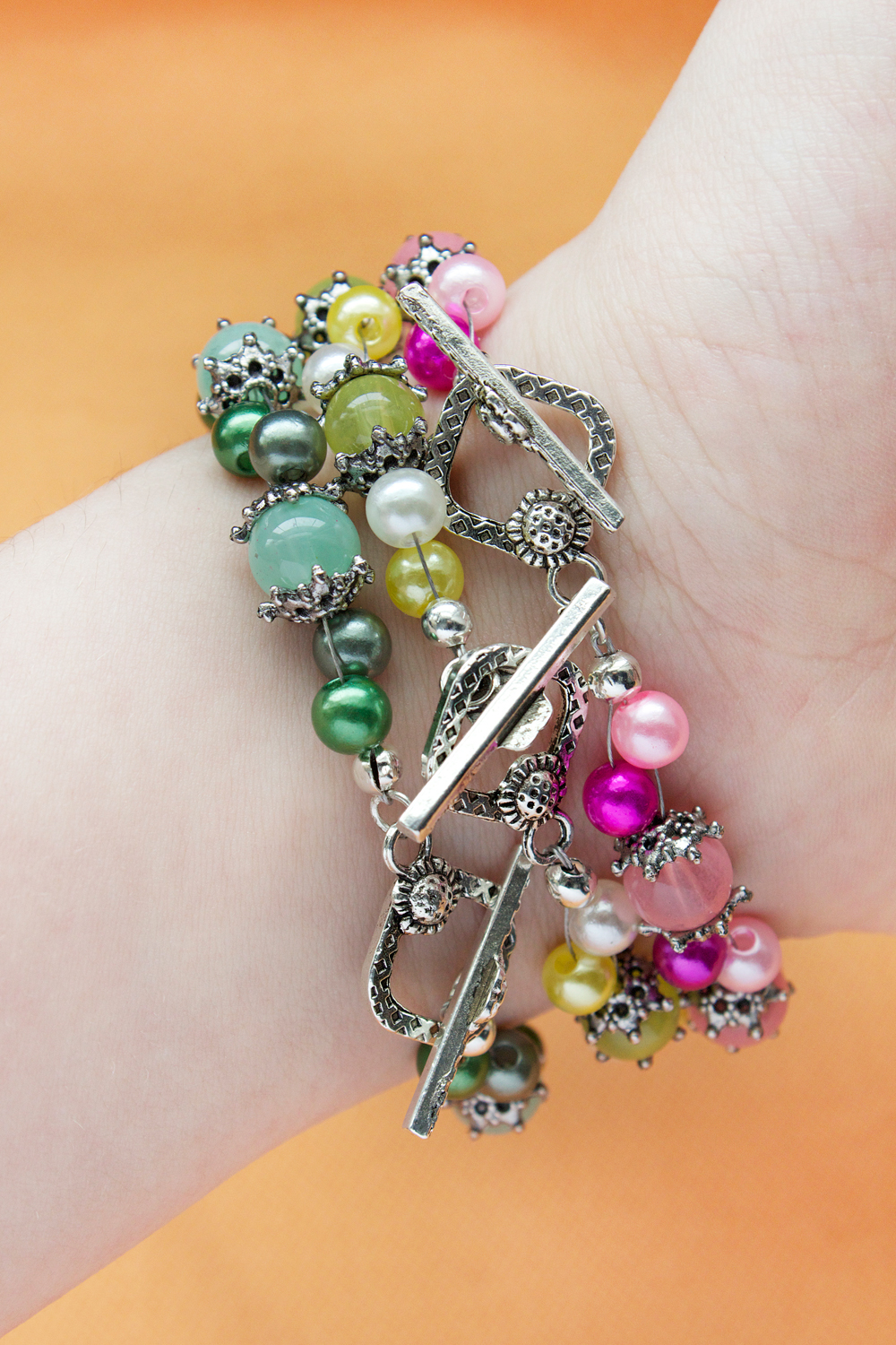 I love the detail of these Pandahall toggles and Cousin bead caps, which contrast nicely against the smooth glass jade and pearl beads. I was inspired to make these after looking on Instagram at tropical beach photos (who wouldn’t when there is six inches of snow outside?!). I saw tropical sorbet and sherbet pictures, complete with fruit toppings and set against the sandy beaches of some oceanside getaway. So, why not try to replicate that color and mood in a bracelet?