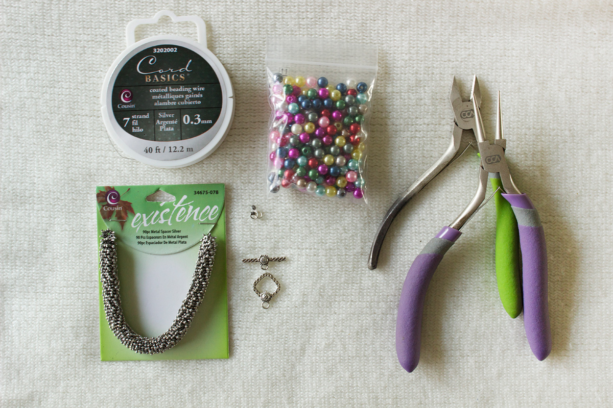 Step 1: Gather materials. Needed are 6mm colored pearls by PandaHall, .3mm silver beading wire (mine from Cousin), silver crimps and jump rings, metal bead caps (mine from Cousin), toggle clasps from PandaHall, and pliers.