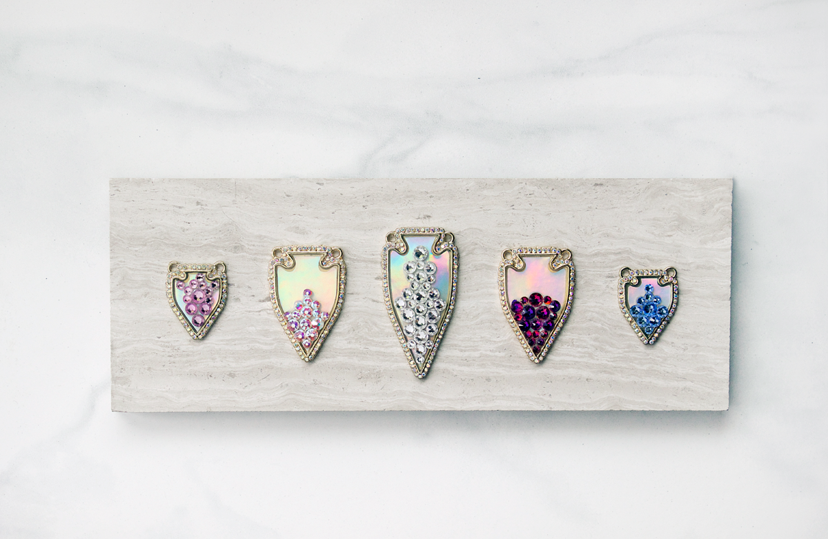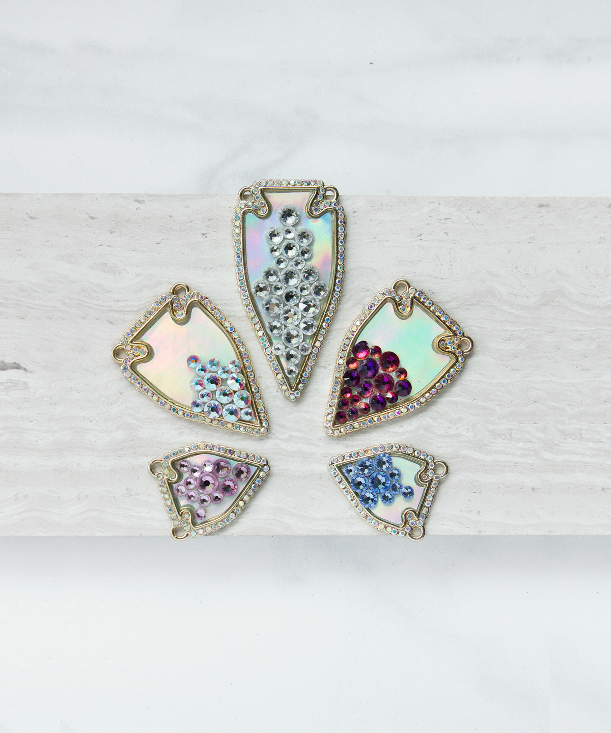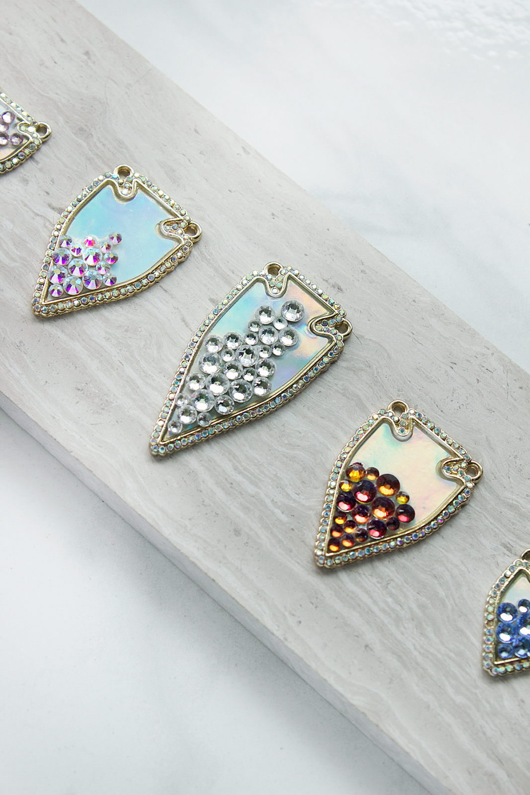 I feel like the more sparkle and shine, the better. Creating these pendants from arrowhead charms I found on Ebay and Swarovski flatback crystals, the mix of color and iridescent background makes for a totally luxe look. Check back soon for my final jewelry creations made with these beauties!